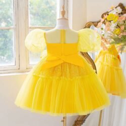 Yellow Girls Sequin Bow Tulle Puff Sleeves Princess Party Dress , Yellow birthday dress