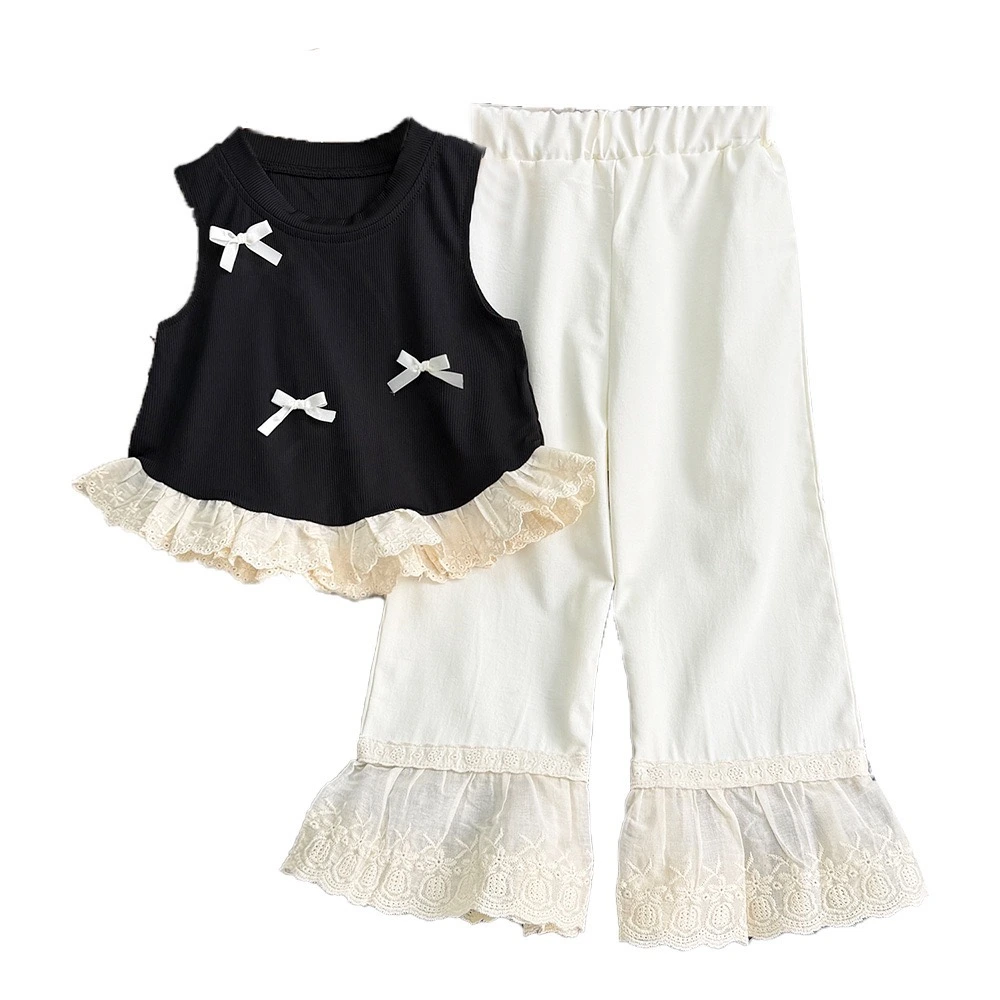 Baby Girls’ Sleeveless Bow Top with Lace Trim Flare Pants Set – 2pcs Set Outfit