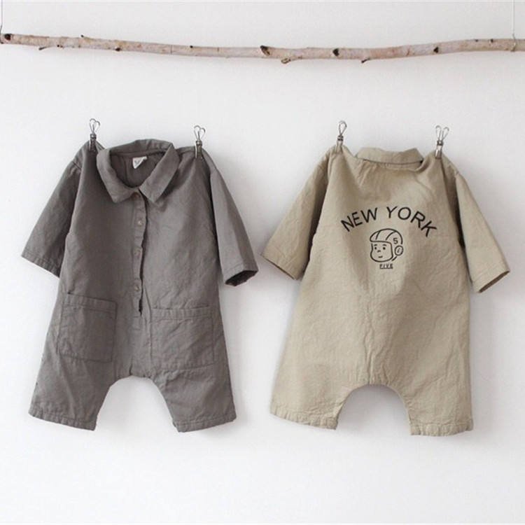 Boys Khaki Olive text on back romper Linen Cotton Lapel Button Jumpsuit