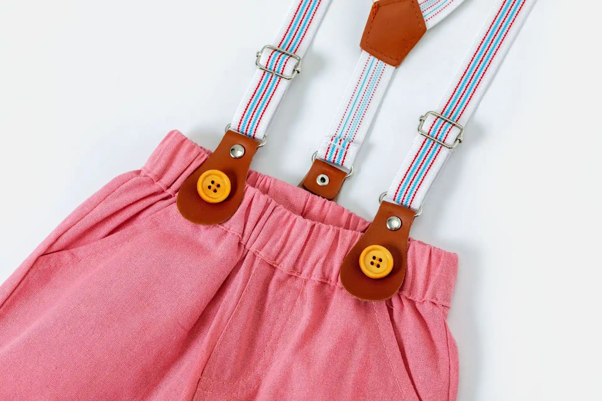 Boys White Formal Romper Shirt with Bow and Pink shorts with suspender belt set