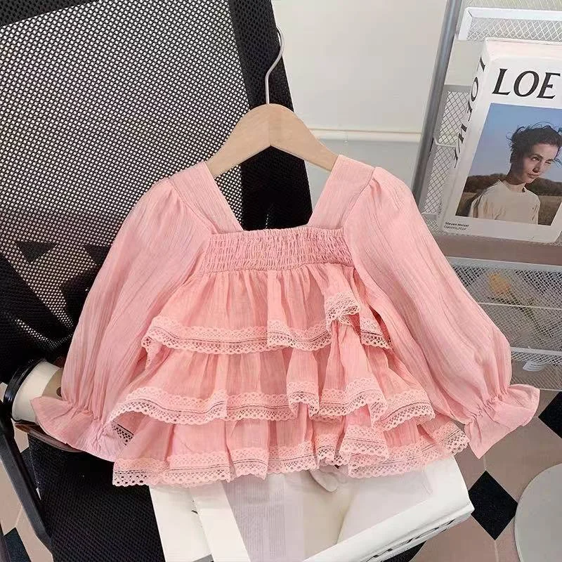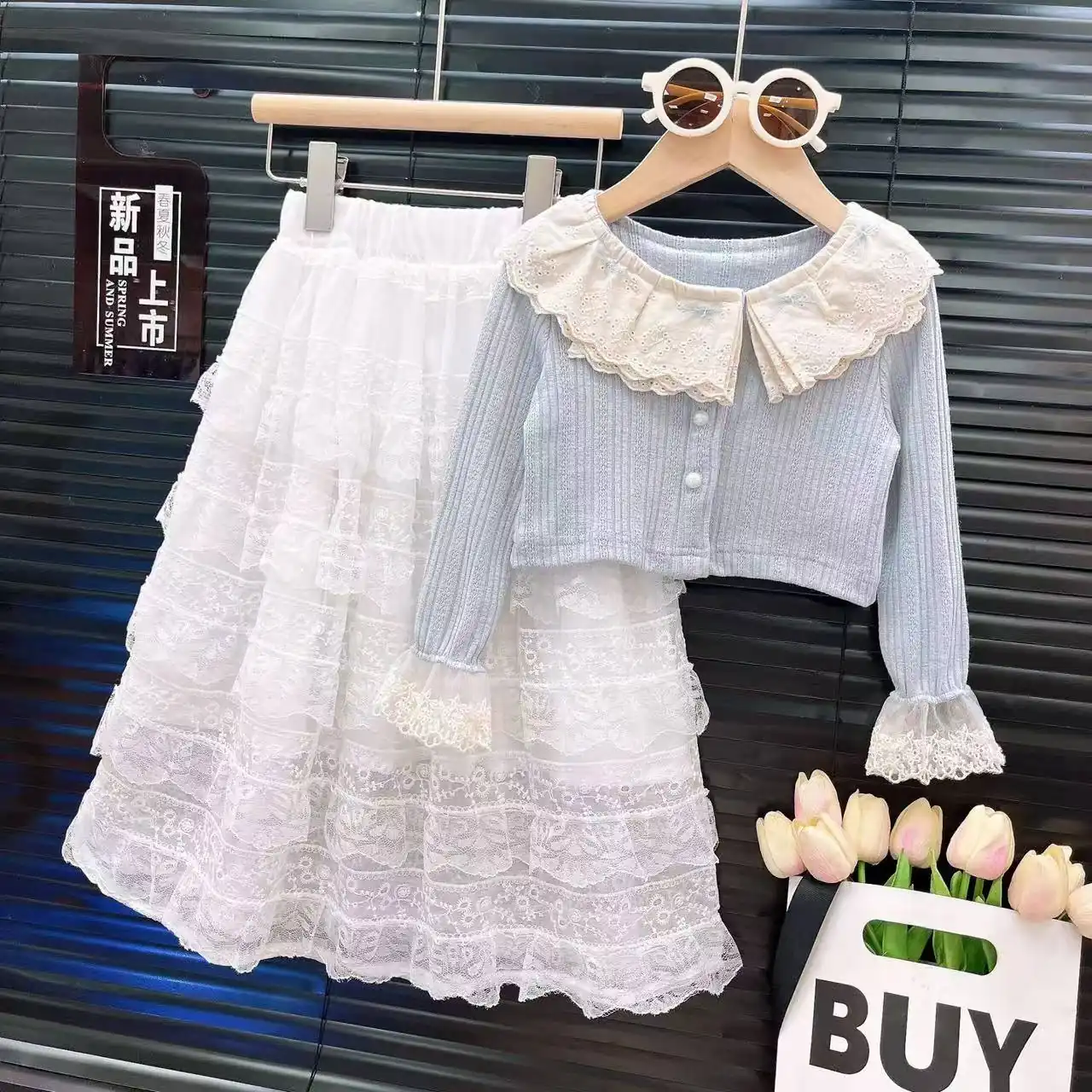Korean Style Full Sleeves Girls’ Lace Blouse + Flare Skirt Clothing Set