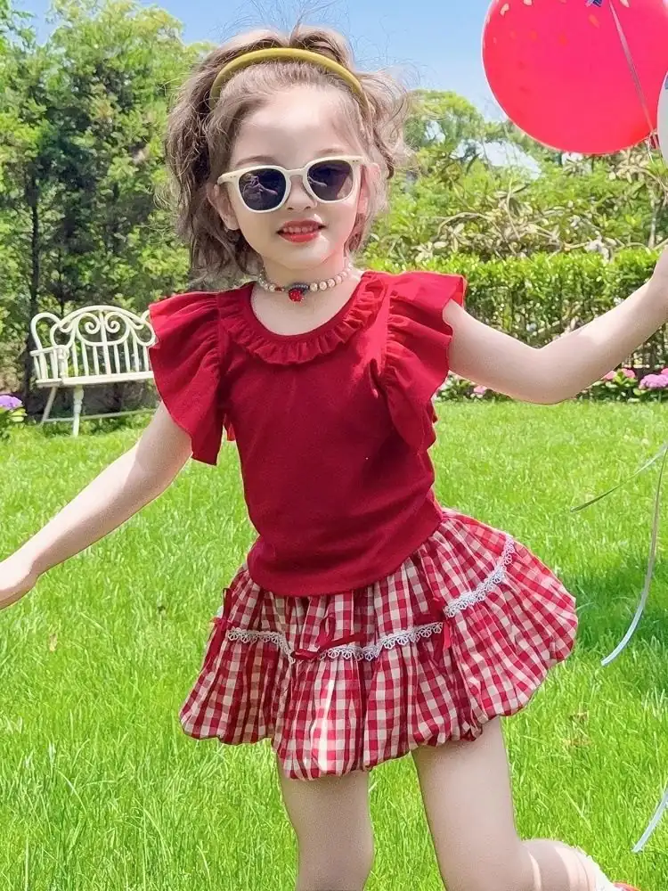 Girls’ Summer Outfit – Ruffle Top and Plaid Skirt Set – Red Dress for Girls
