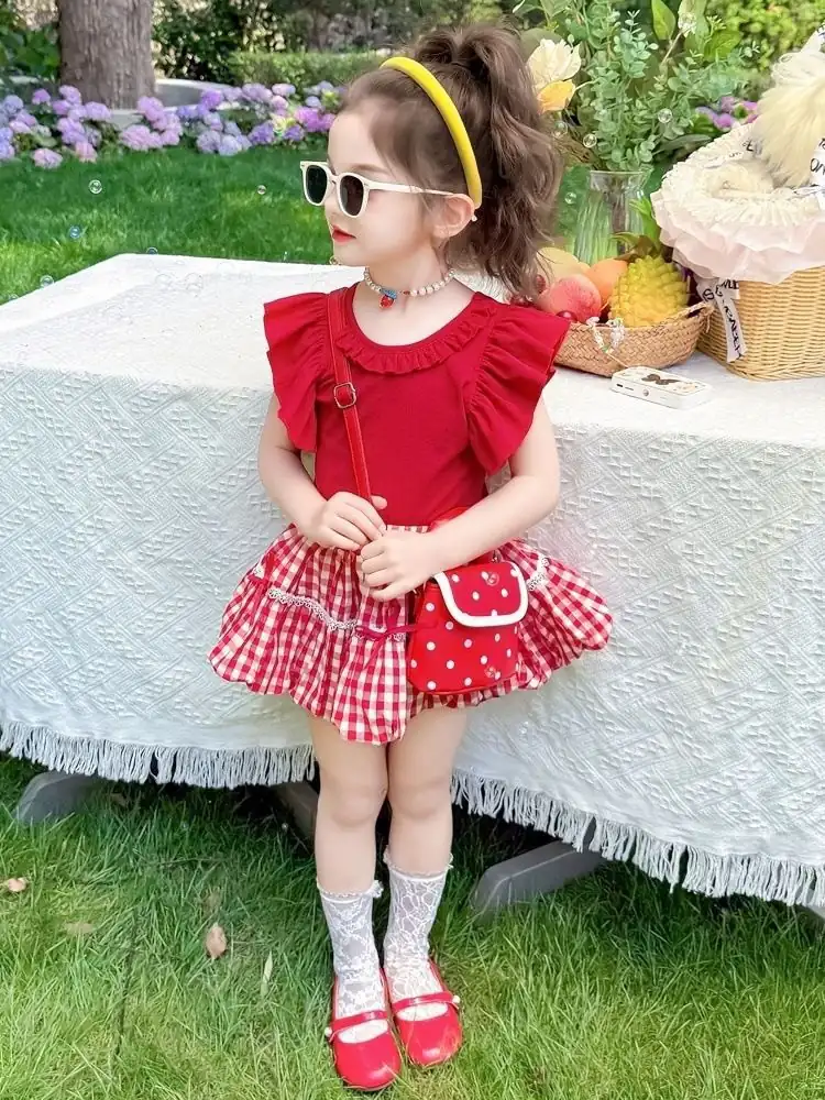 Girls’ Summer Outfit – Ruffle Top and Plaid Skirt Set – Red Dress for Girls