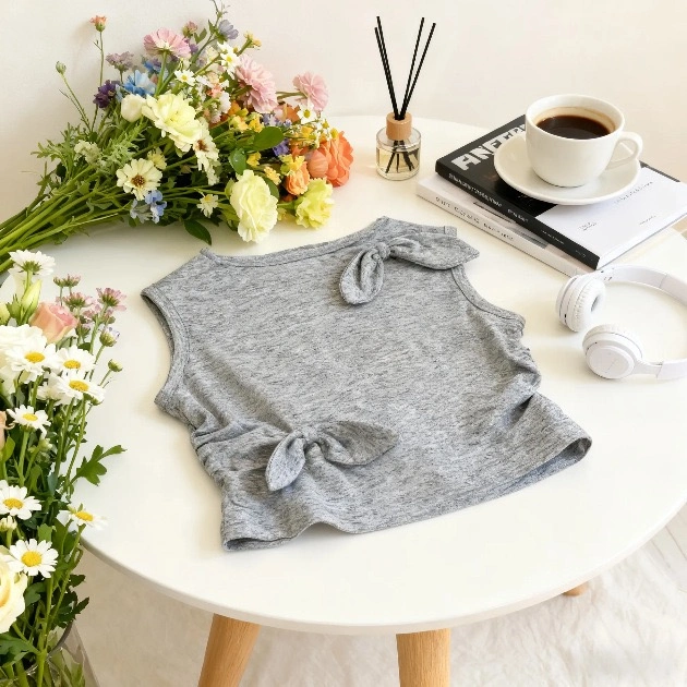 Korean Girls’ Summer 2-Piece Set – Gray Solid Vest & Checkered Skirt Shorts Outfit