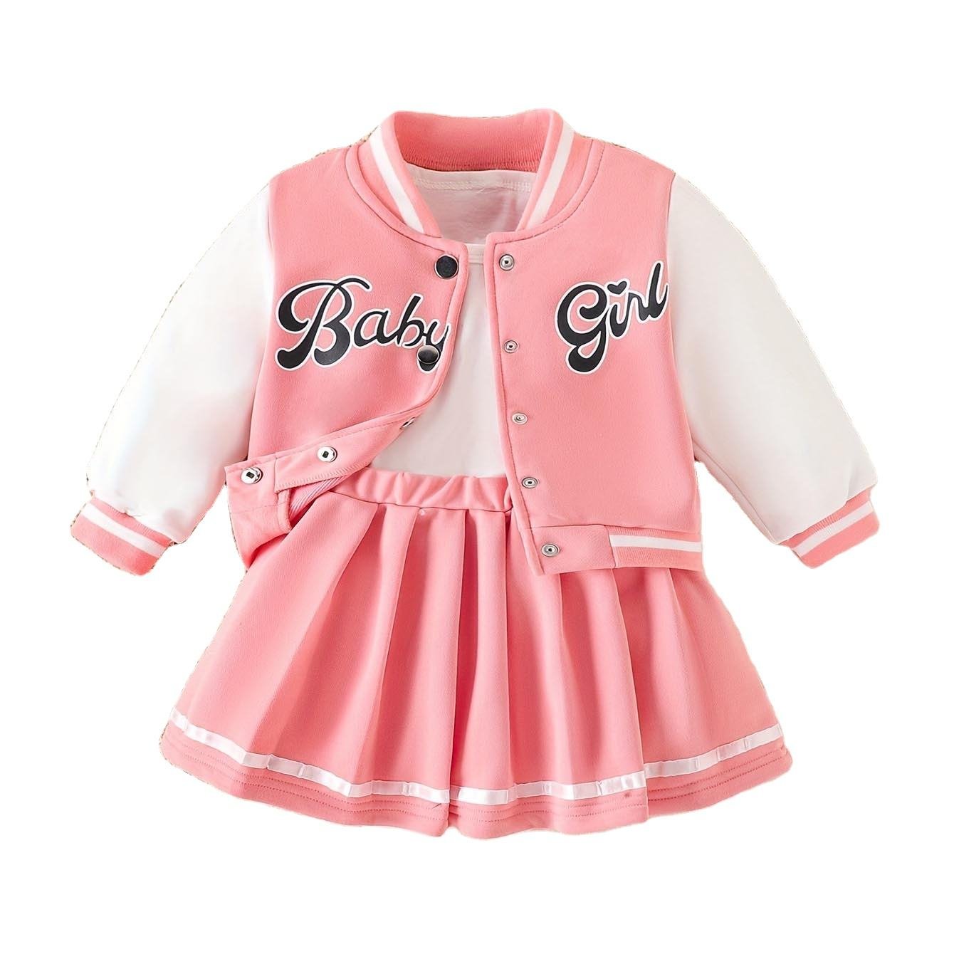 Embroidered Letters Pleated Skirt Sporty Style and Baseball jacket Set