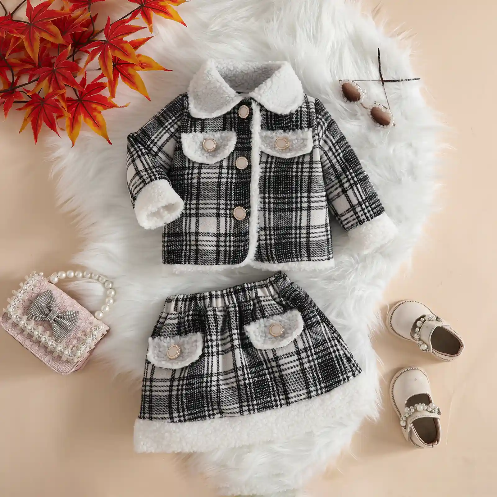 Girls Fleece Jacket & Skirt Set – Black Checkered Design with White Cuffs and Pockets – infant and toddler