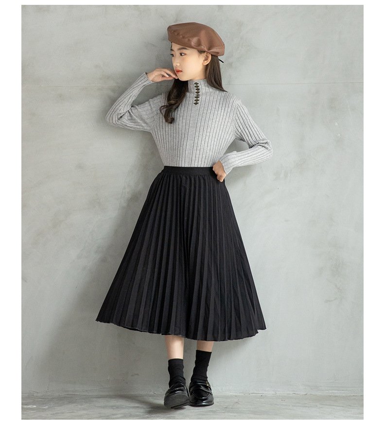 Fashionable Thick Long layered Pleated Black Skirt and Grey High Neck Top Set 5-10Y