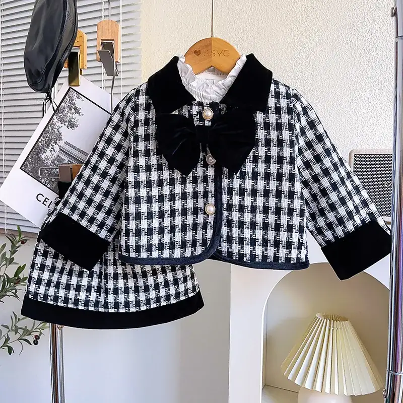 Girls Fleece Jacket & Skirt Set – Black Checkered Design with White Cuffs and Pockets – infant and toddler